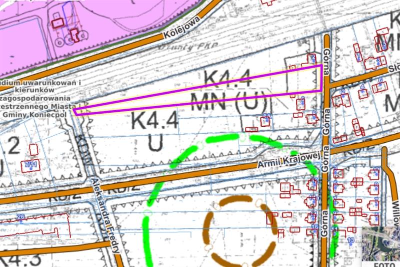 2. Działka o powierzchni 5164 m2 znajdująca się obok skrzyżowania ulicy Górnej oraz Armii Krajowej, w kształcie trójka o podstawie od ulicy Górnej około 30 metrów, w MPZP przeznaczona pod: teren o powierzchni ok. 1100 m2 pod budownictwo mieszkaniowe jednorodzinne, reszta działki po powierzchni około 4000 md usługi, ze względu na kształt działki ewentualne wykorzystanie terenu pod usługi to maksymalnie około 1500 m2.  Działka zadrzewiona. W ulicy Górnej znajdują się: woda, prąd i kanalizacja.