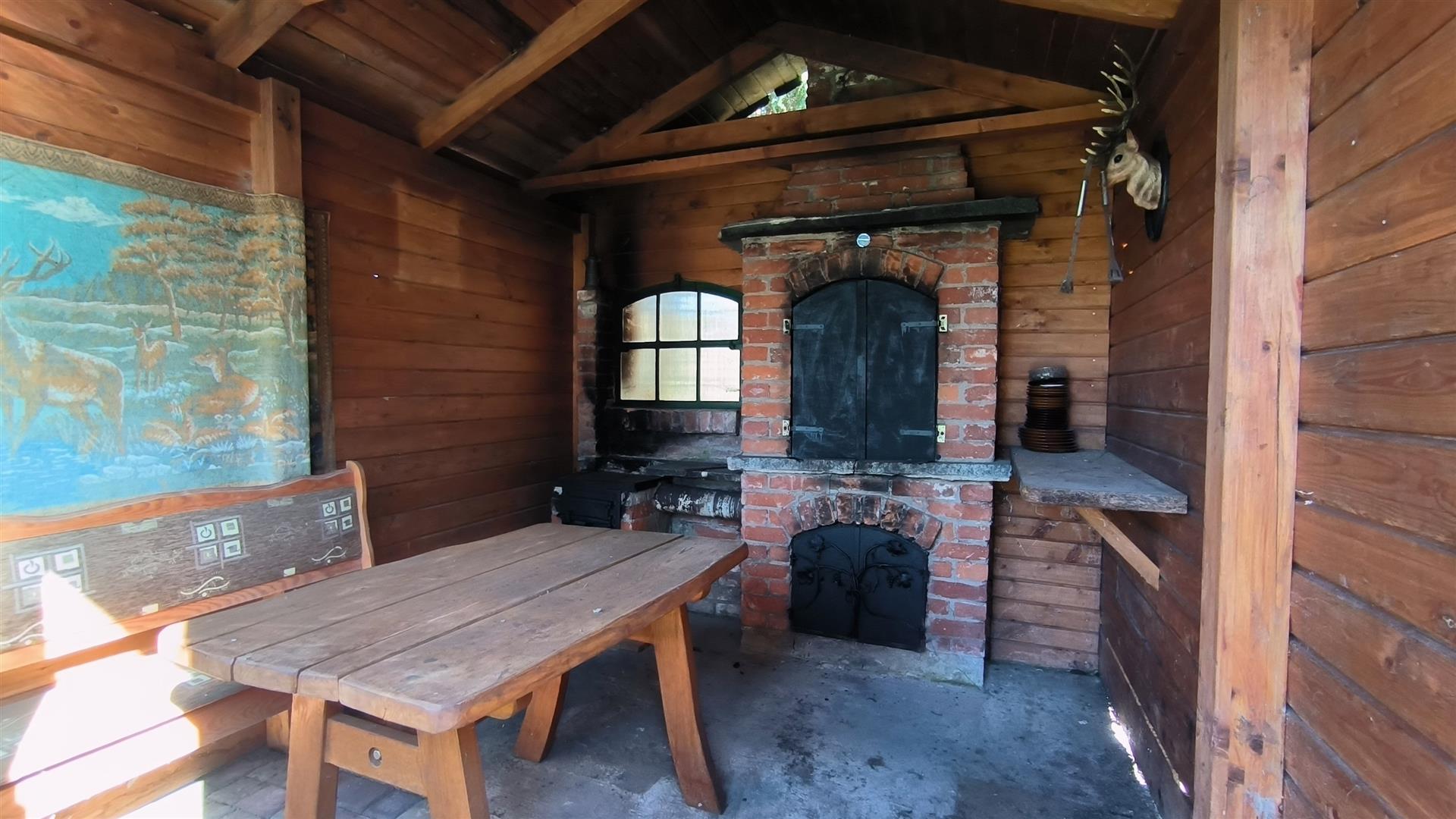 Teren jest ogrodzony, z altaną i wędzarnią, domkiem gospodarczym oraz wiatą samochodową.