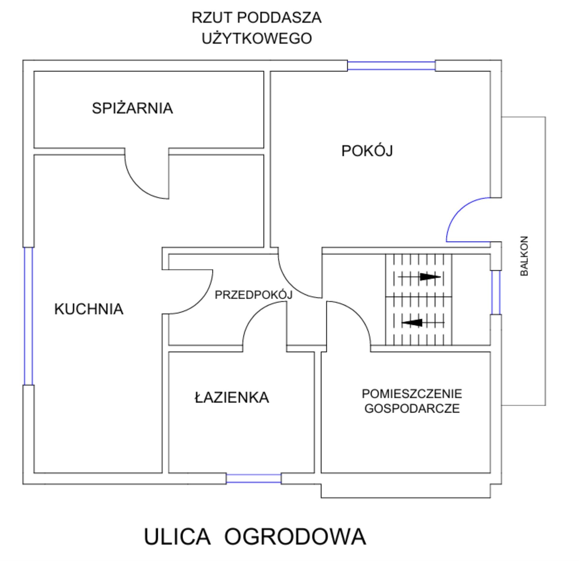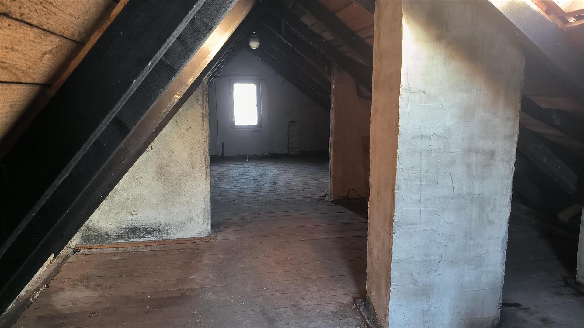 Na poddaszu użytkowym znajduje się duża kuchnia ok. 18 m2 z piecem kuchennym kaflowym oraz spiżarnią, pokój z wyjściem na balkon 12,50 m2, pomieszczenie gospodarcze ok. 4,50 m2, łazienka 3,5 m2 oraz przedpokój. Podłogi pokryte deskami. W przedpokoju znajduje się właz z wyjściem na strych nieużytkowy.