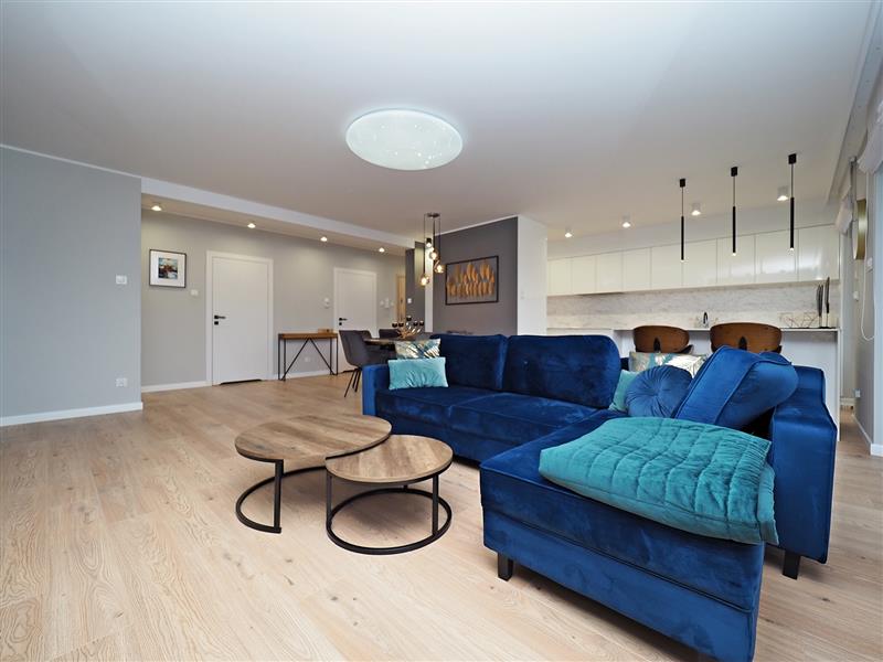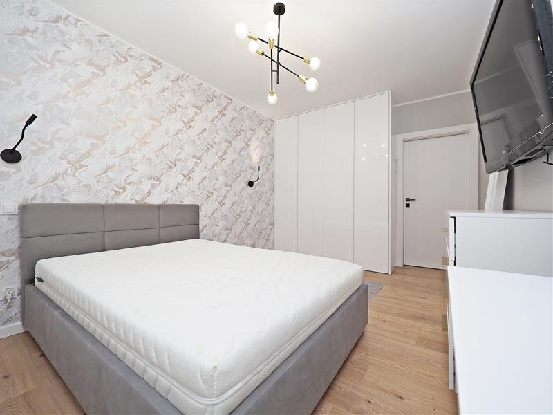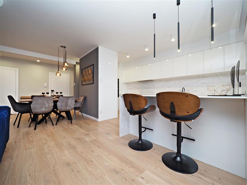 Z innych atutów mieszkania należy wspomnieć o przestronnej kuchni pod wymiar z blatami ze spieku kwarcowego, sprzętem AGD wysokiej klasy oraz wygospodarowanym miejscu na pralkę i suszarkę. Na tarasie wypoczynkowe meble ogrodowe.