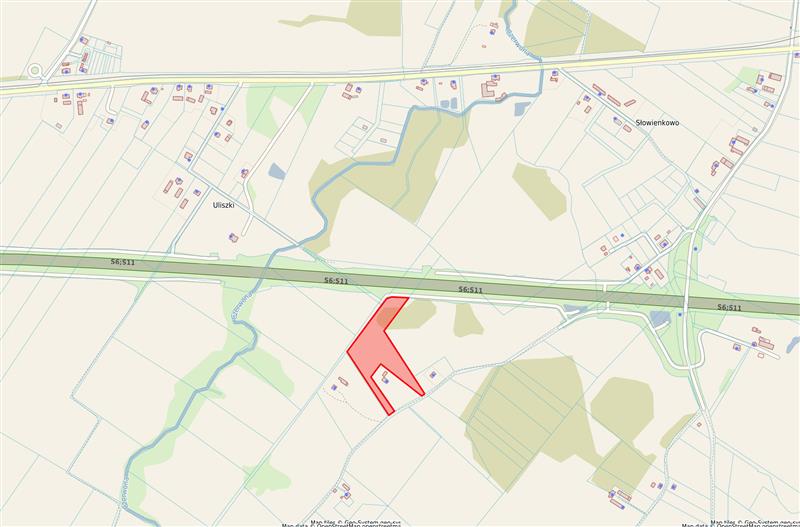 Stan prawny: działka niezabudowana, brak WZ, ale istnieje możliwość uzyskania warunków zabudowy na dom ze względu na dobre sąsiedztwo lub na usługi ze względu na bliskość drogi S6.