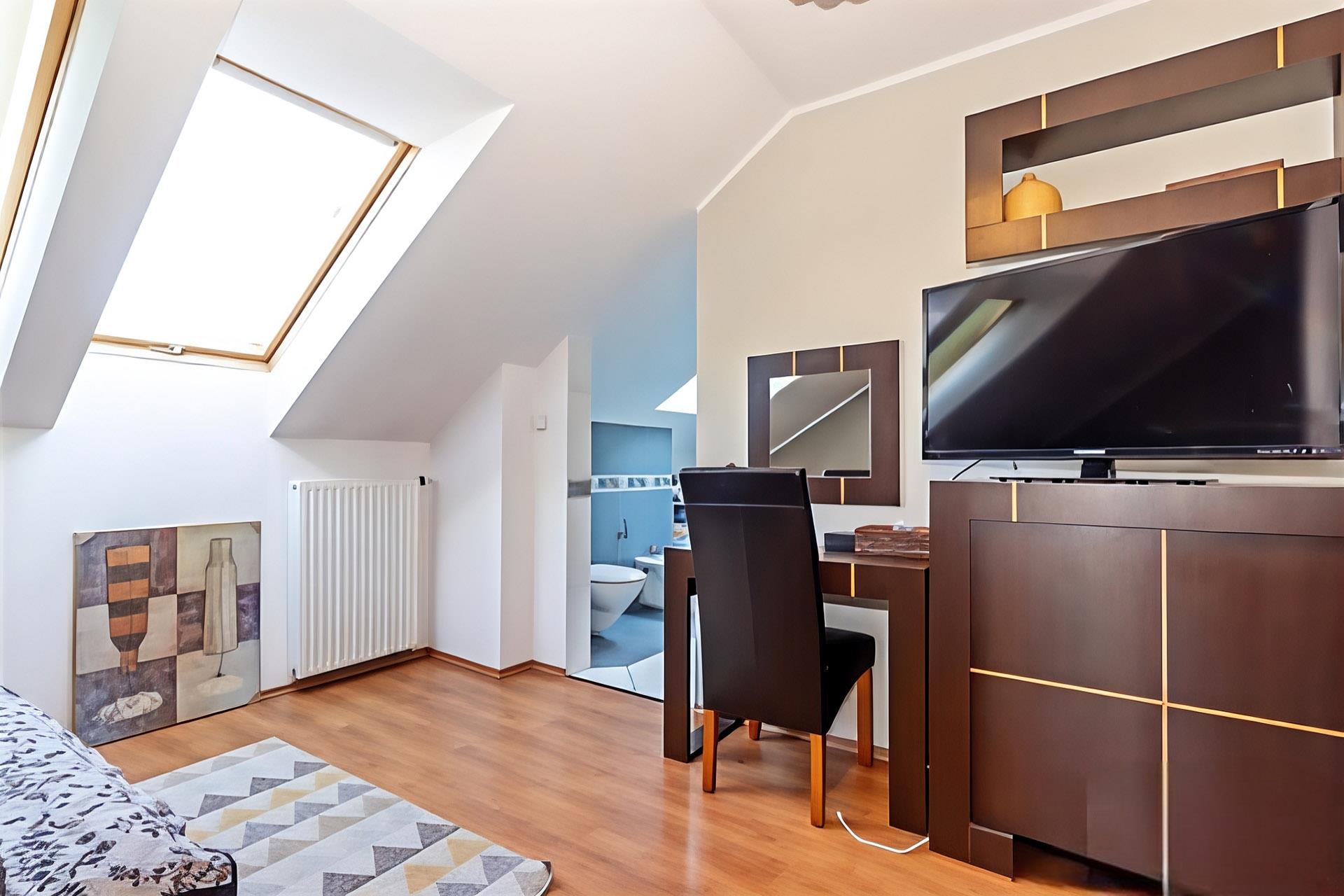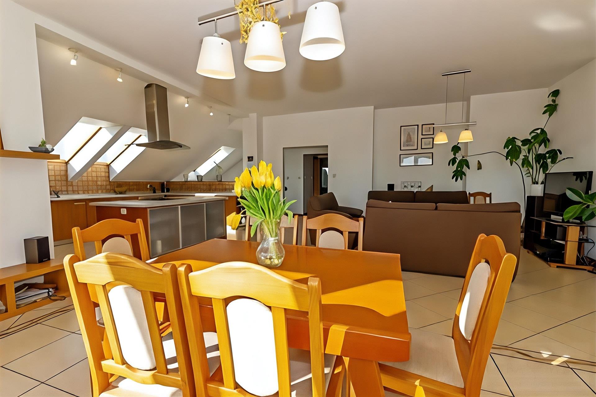 - Mieszkanie o pow. 170 m2; salon z kuchnią i jadalnią, 3 pokoje, sypialnia z łazienką, spiżarnia, łazienka, hall.
