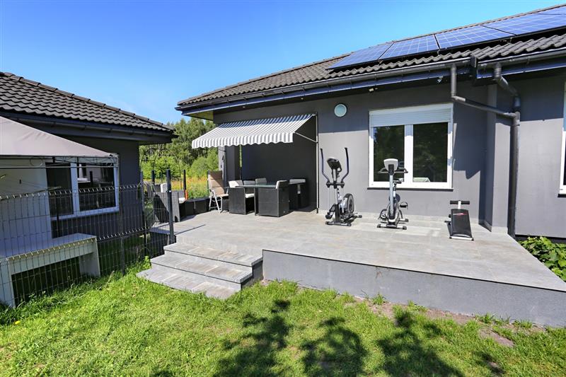 Dom posadowiony jest na działce o powierzchni 919 m2. Teren w pełni ogrodzony, z licznymi nasadzeniami – krzewami, drzewami i roślinnością ozdobną. Na posesji znajduje się także basen stelażowy, idealny na letnie dni.