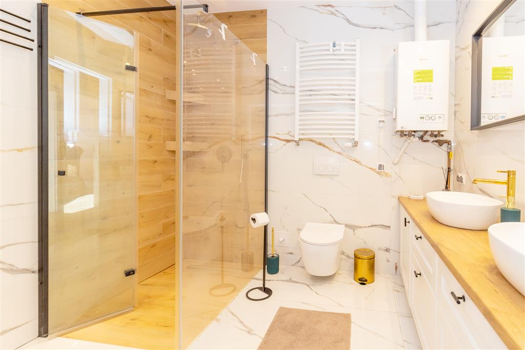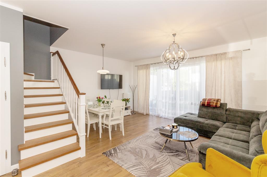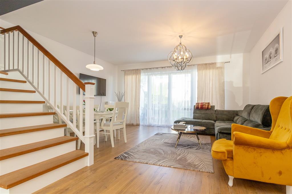 Na parterze mamy wiatrołap, przestronny salon z otwartą kuchnią z którego wychodzimy na ogród. Na tym poziomie znajduje się również pomieszczenie gospodarcze w którym znajduje się piec gazowy (dwufunkcyjny) oraz pomieszczenie WC. Na piętrze znajdują się 3 sypialnie ( jedna z garderobą), duża łazienka oraz przedpokój.