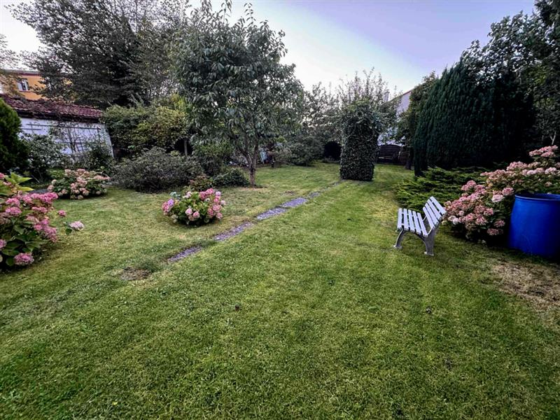 Z tyłu domu rozciąga się piękny, zadbany ogród z licznymi nasadzeniami: