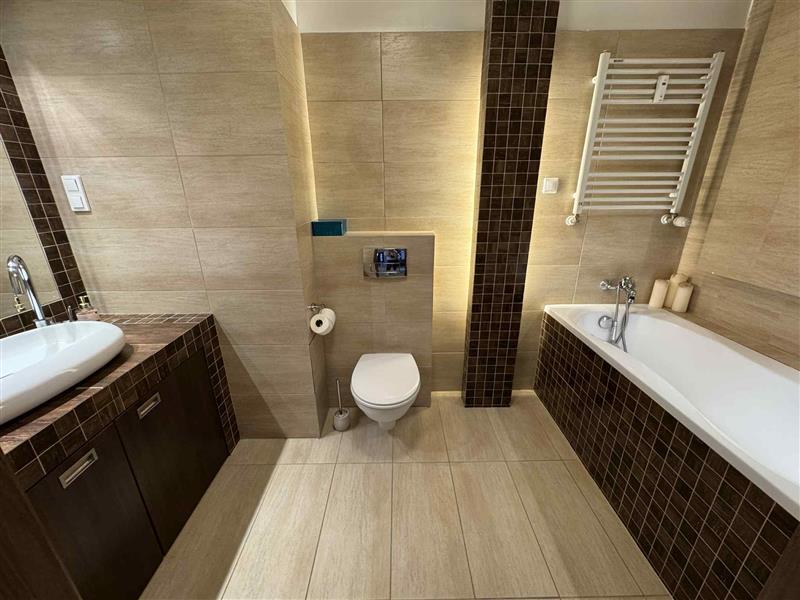 W mieszkaniu na podłogach w pokojach panele, na korytarzu, kuchni i łazienkach terakota. W kuchni w cenie mieszkania meble na wymiar , piekarnik ( Bosch ), płyta indukcyjna ( Bosch ), okap ( Mastercook ), zmywarka ( Elektrolux ). W trzech pokojach szafy w zabudowie.