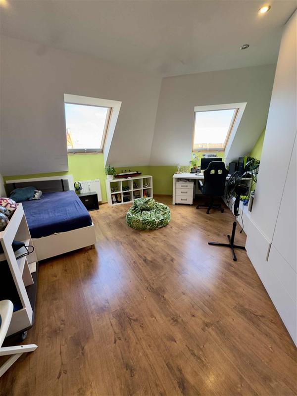 Na piętrze pokój młodzieżowy, gabinet oraz łazienka z prysznicem. Łazienka świeżo po remoncie. Na końcu górnego korytarza schowek / spiżarnia w zabudowie.