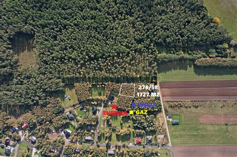 Media: woda w odległości ok. 12 m, gaz w odległości ok. 50 m, energia w odległości ok. 80 m. Wymiary działki ok. 41x41 m.