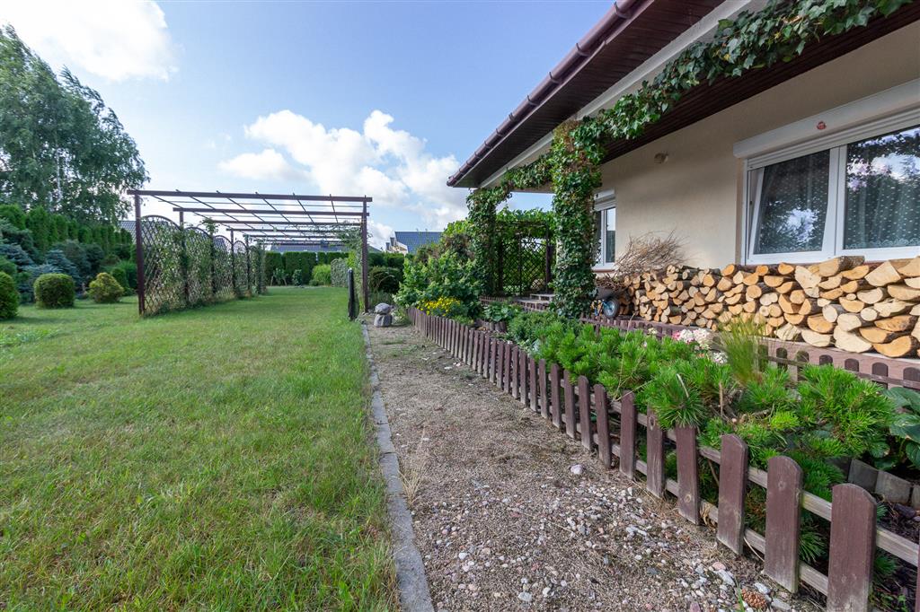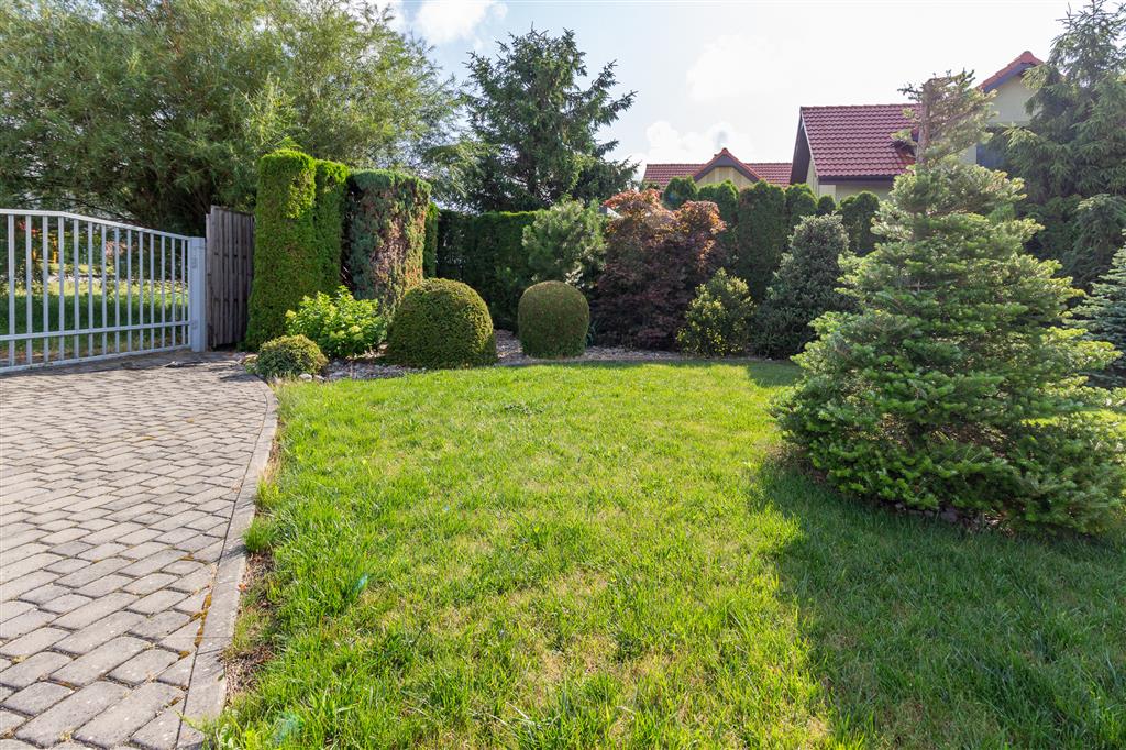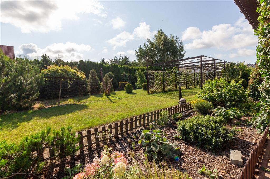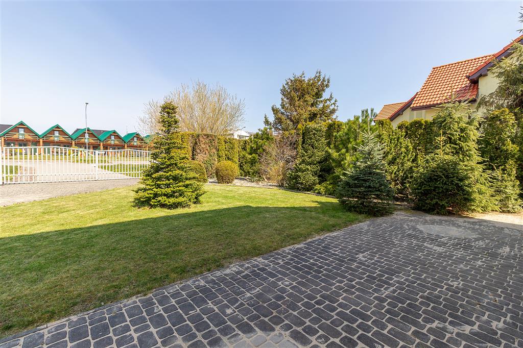 Pięknie zagospodarowana posesja: liczne nasadzenia, pergole z winoroślami, zadbane trawniki. Pod powierzchnią trawnika znajdują się zbiorniki na wodę deszczową, która można wykorzystać do nawodnienia ogrodu. Cała działka ogrodzona, 2 bramy wjazdowe. Na terenie posesji znajduje się również parking na 6 aut.