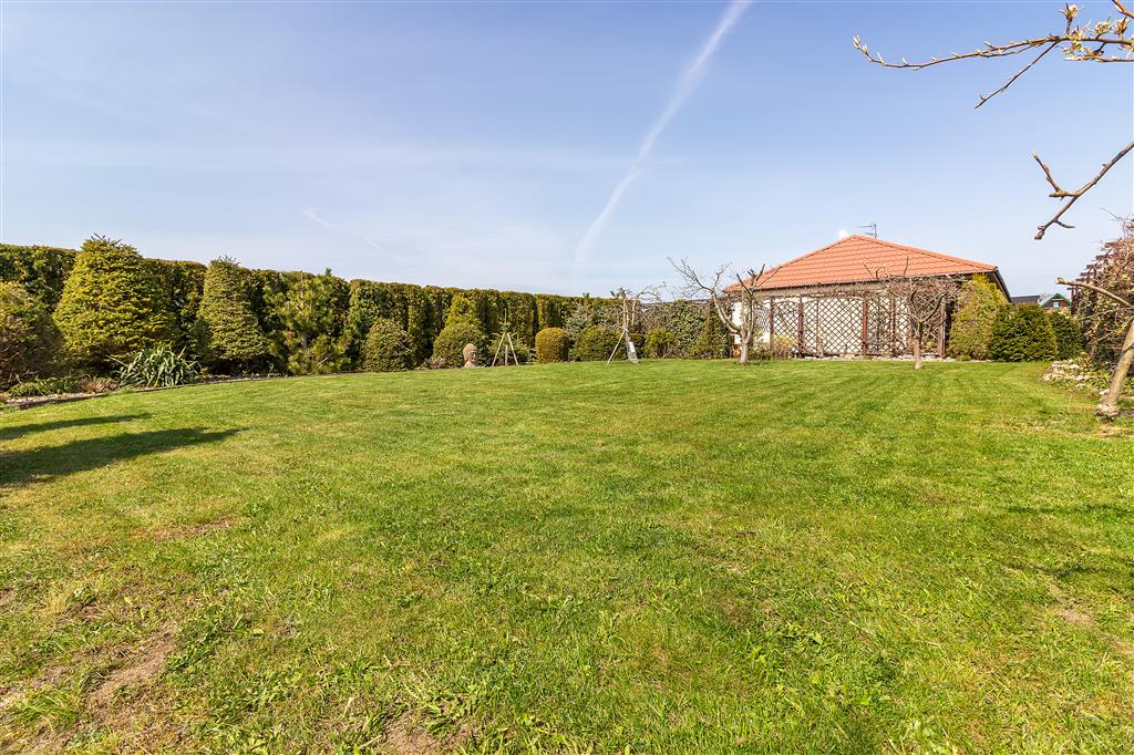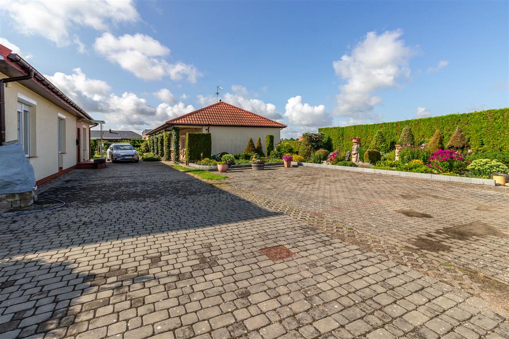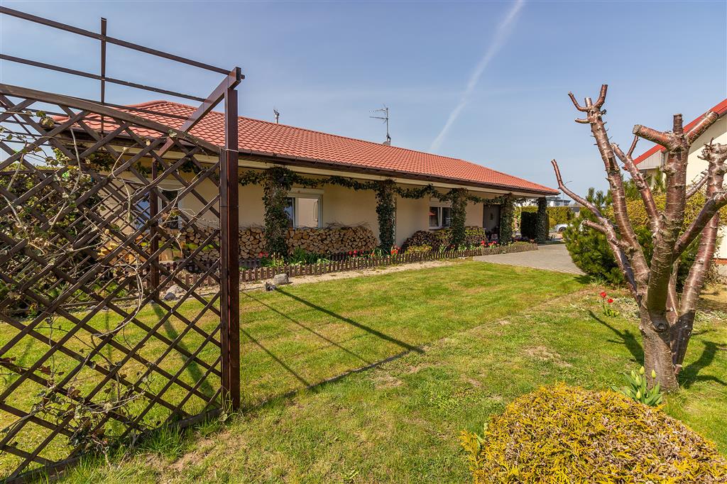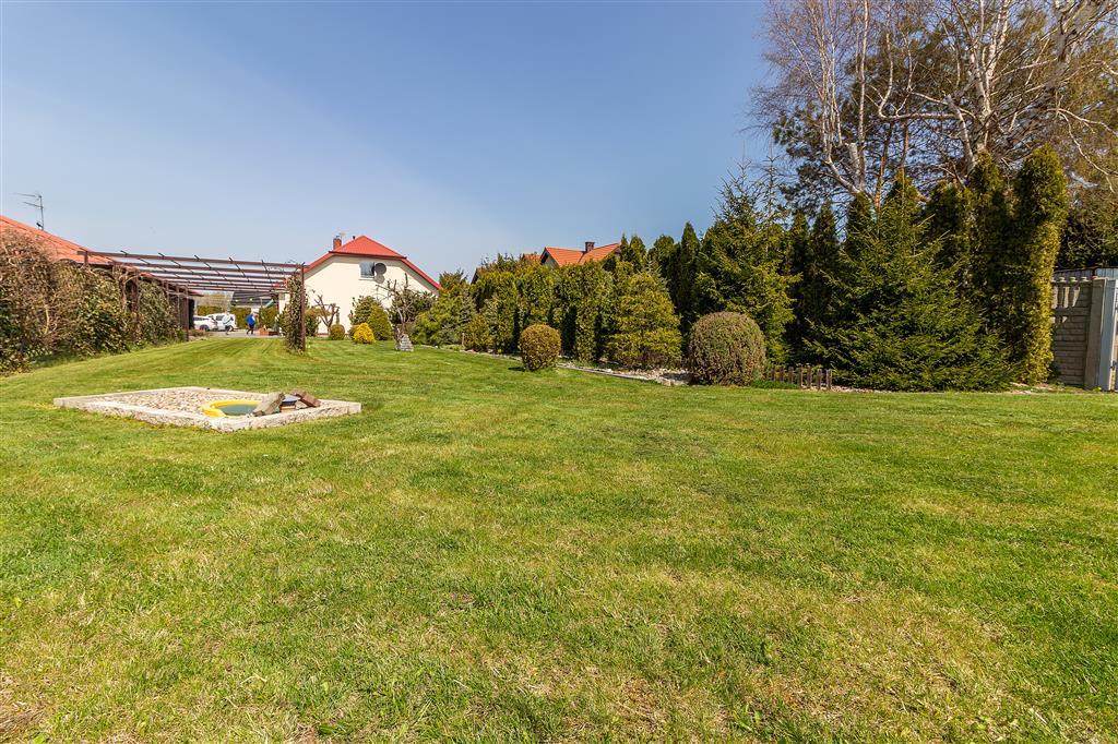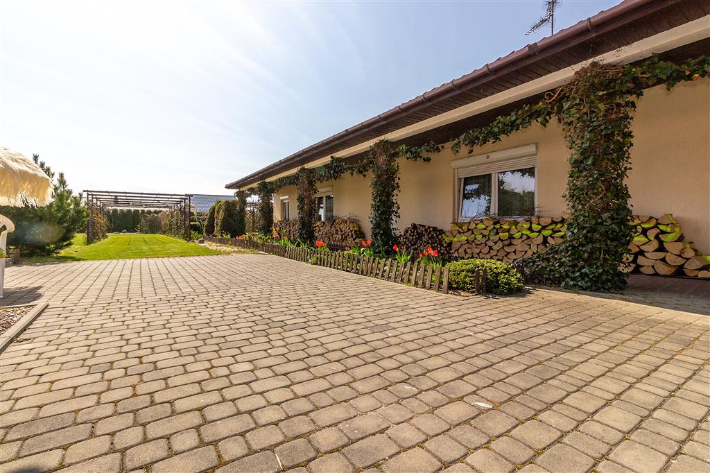 Pięknie zagospodarowana posesja: liczne nasadzenia, pergole z winoroślami, zadbane trawniki. Pod powierzchnią trawnika znajdują się zbiorniki na wodę deszczową, która można wykorzystać do nawodnienia ogrodu. Cała działka ogrodzona, 2 bramy wjazdowe. Na terenie posesji znajduje się również parking na 6 aut.