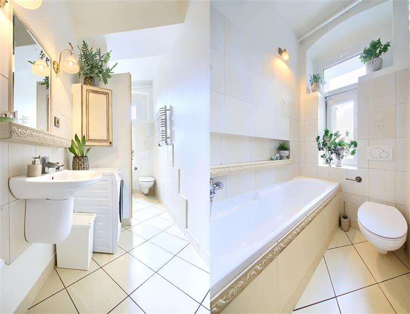 • łazienki z wanną, oknem, szafkami i miejscem na pralkę,