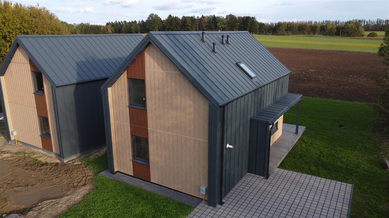 ?- elewacja łączona – blacha na rąbek + panele drewnopodobne VOX