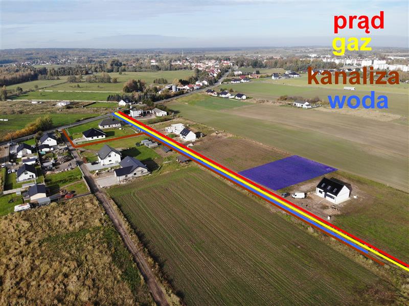 Media: prąd, woda, kanalizacja i gaz w drodze przy granicy działki.