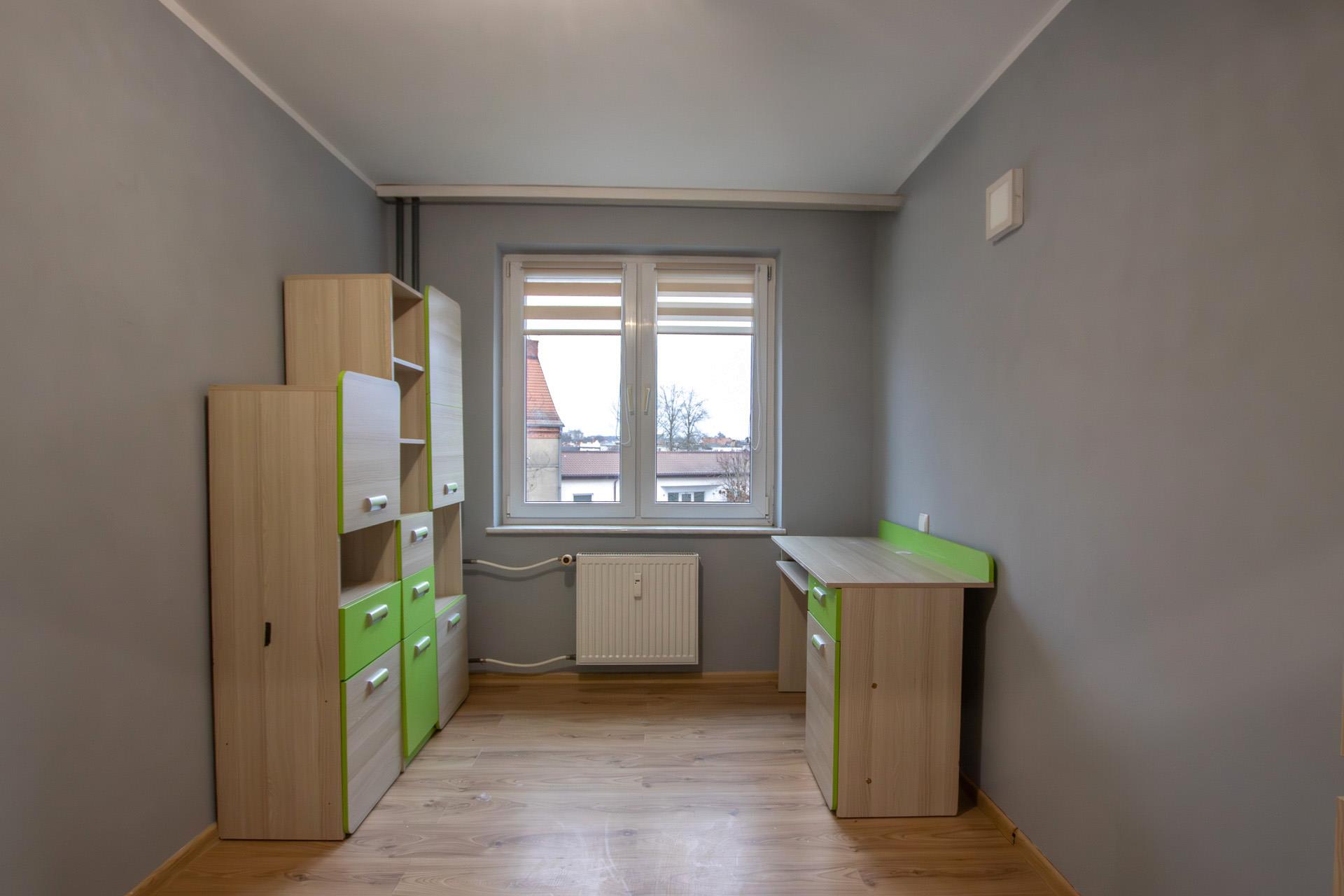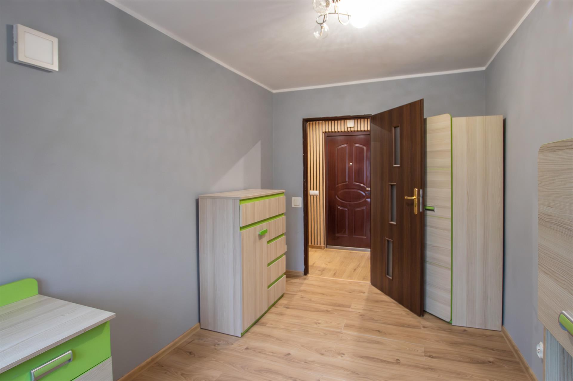 W pokojach i przedpokoju na podłogach panele, w kuchni terakota.