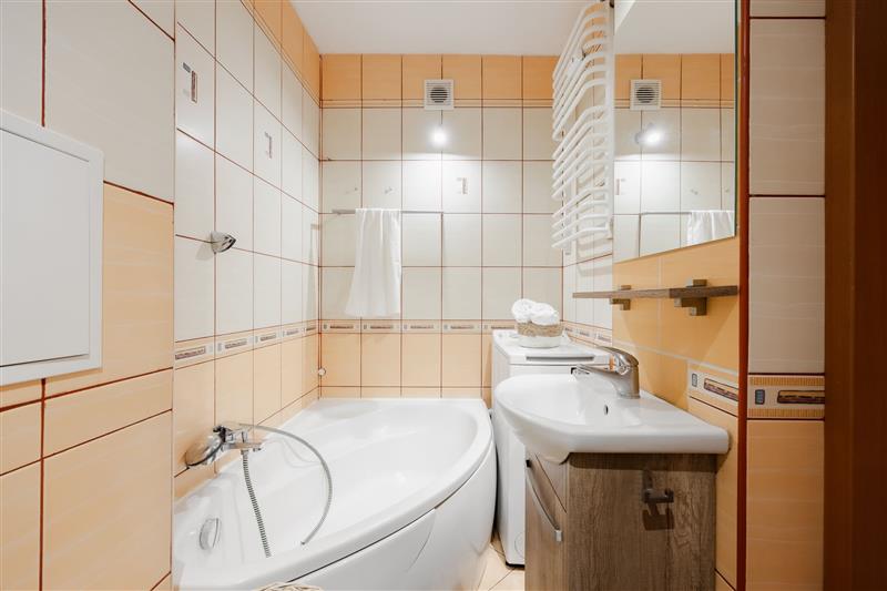 • duża łazienka z wanną, wyposażona w pralkę oraz kosz na pranie,