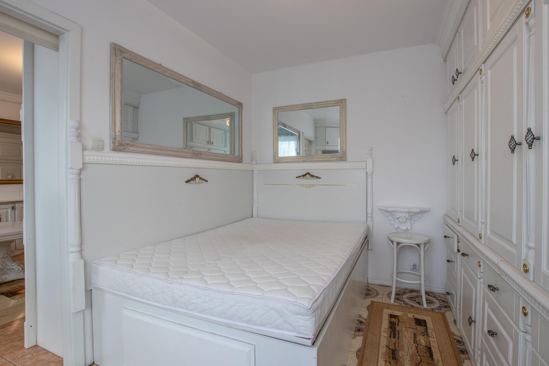 Pokój dzienny i sypialnia: terakota, kanapa, łóżko, meble pokojowe, zabudowy, komoda.