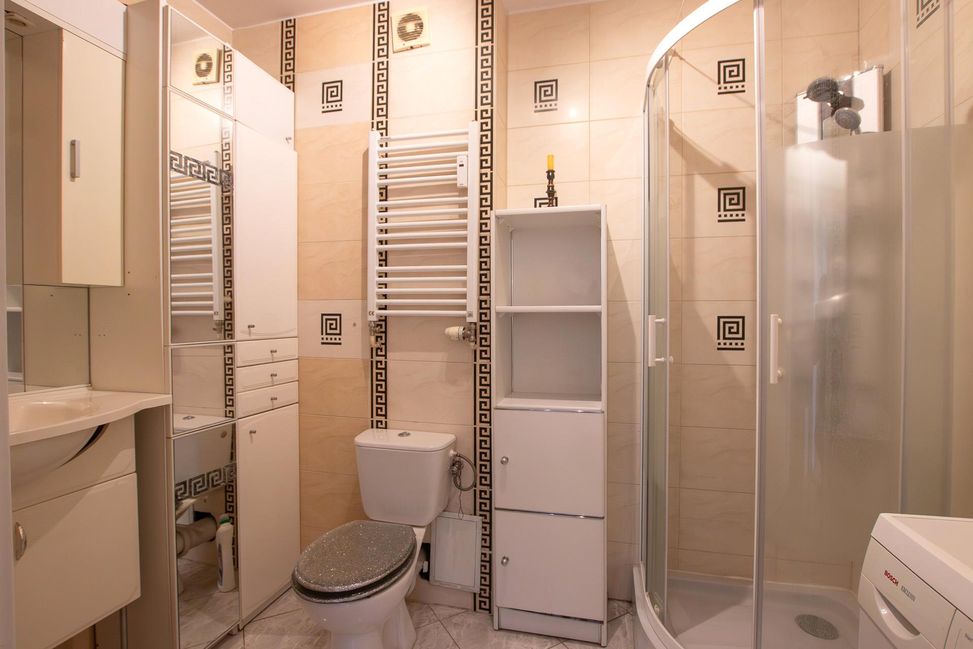 Łazienka: terakota, glazura, kabina natrysk, umywalka, kompakt, pralka.