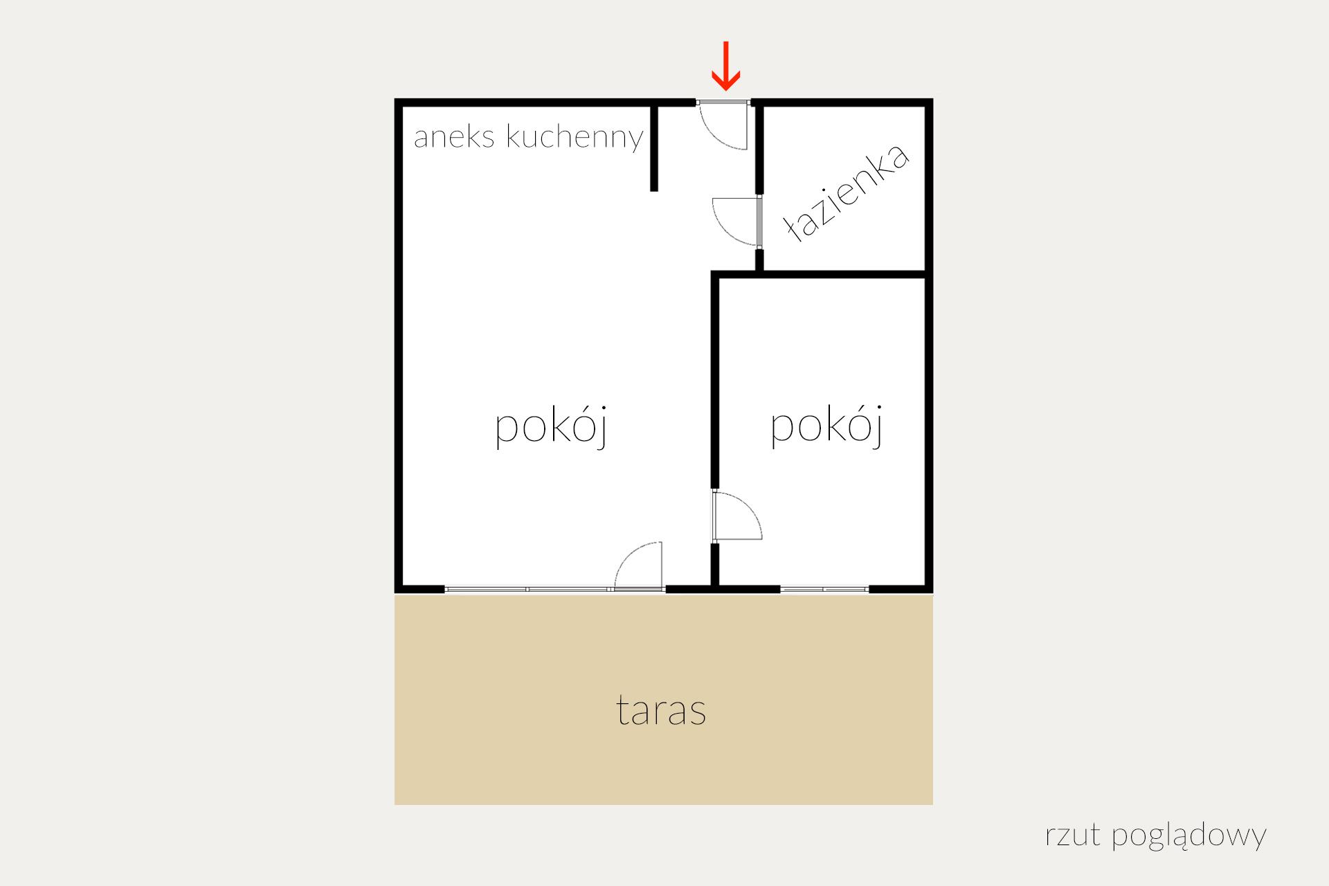 - pokój dzienny z aneksem kuchennym i wyjściem na taras;