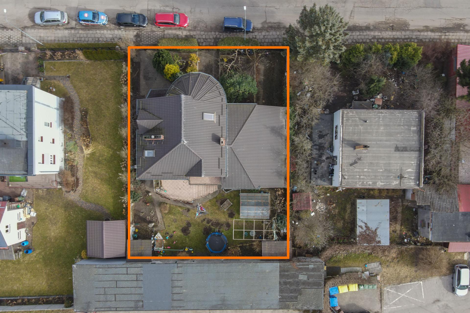Działka o pow. 593 m2, ogrodzona i zagospodarowana (trawniki, nasadzenia).