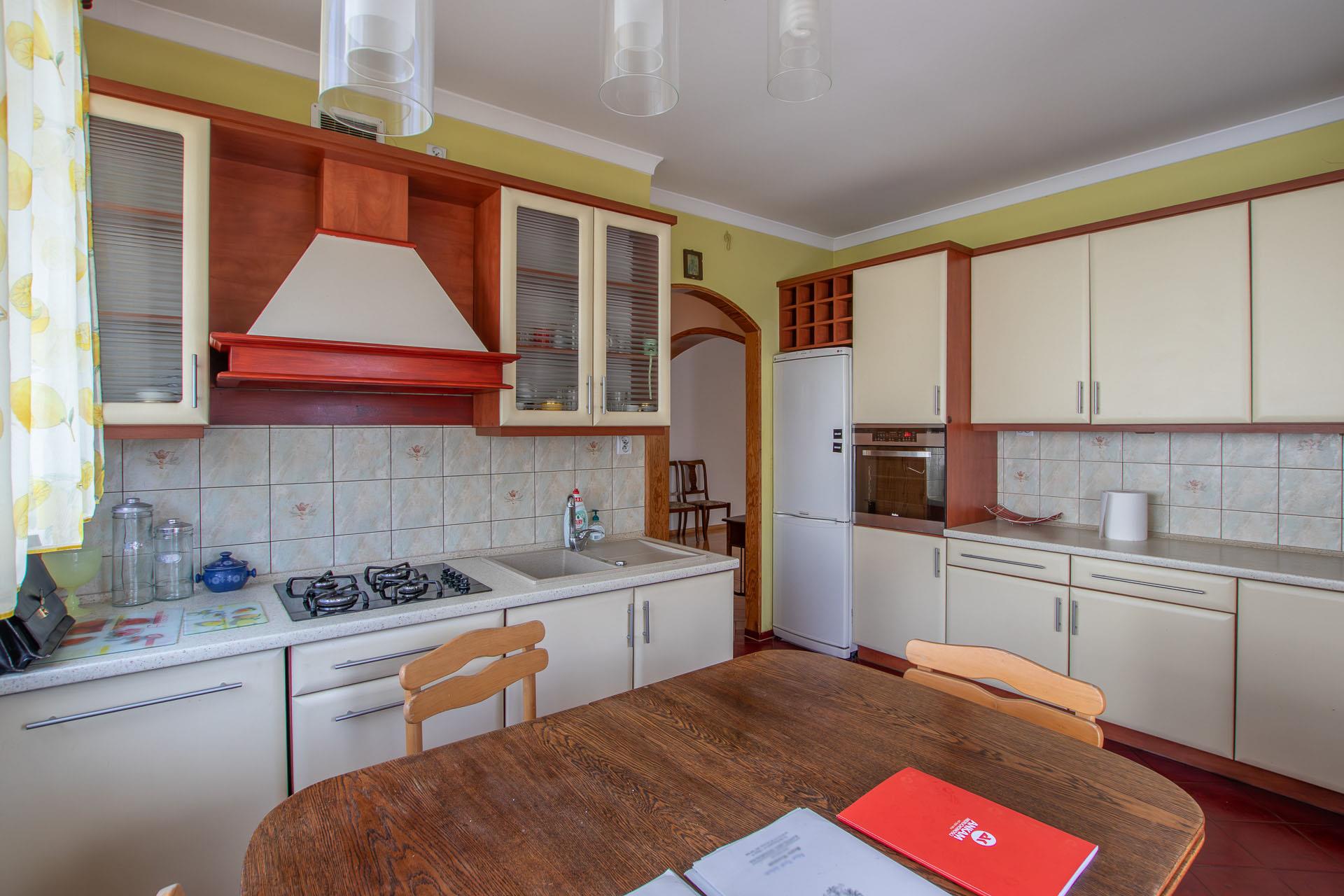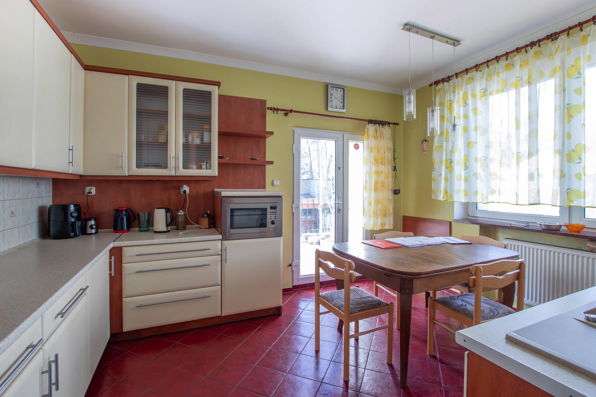 W kuchni terakota, zabudowa kuchenna; w łazienkach terakota, glazura, kabiny natryskowe.