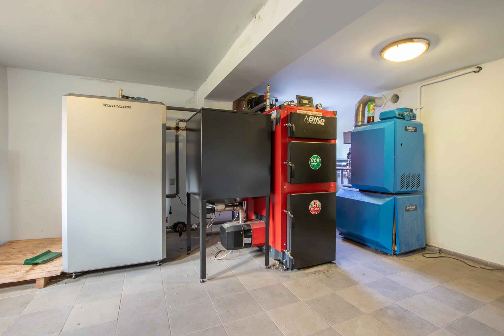 Ogrzewanie własne gazowe, piec II- funkcyjny Firmy Buderus oraz nowy piec na pellet.