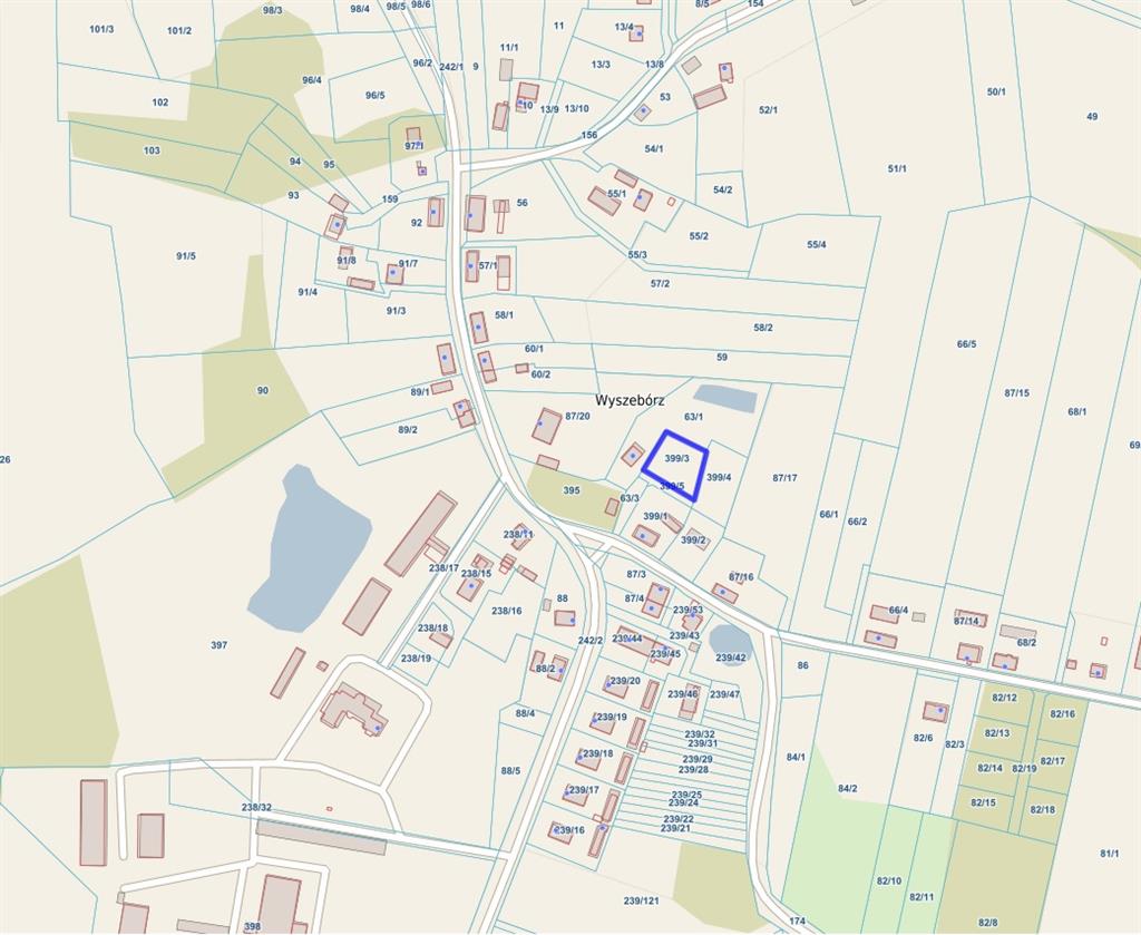 Działka o powierzchni 1232 m2 położona w miejscowości Wyszebórz, dla której zostały wydane warunki zabudowy.