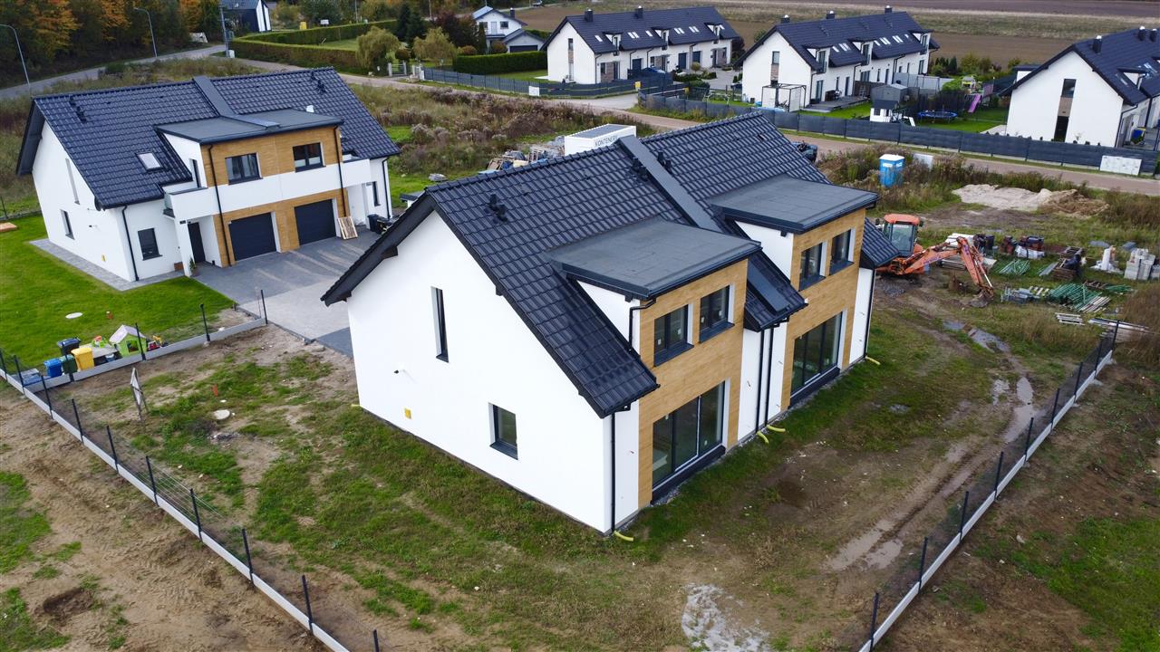 Okna trzy szyby grafitowe montowane w systemie ciepły montaż, dodatkowo zostaną zamontowane termoparapety, drzwi wejściowe Gerda antywłamaniowe grafitowe, brama garażowa z napędem grafitowa, elewacja 15 cm styropianu, dachówka ceramiczna, wewnątrz tynki gipsowe, posadzka na gruncie betonowa w tym styropian 15 cm, piec gazowy jednofunkcyjny z zasobnikiem, wykonanie instalacji elektrycznej wewnątrz budynku oraz instalacji alarmowej i pod monitoring, na posesji kostka polbrukowa w kolorze grafitowym.